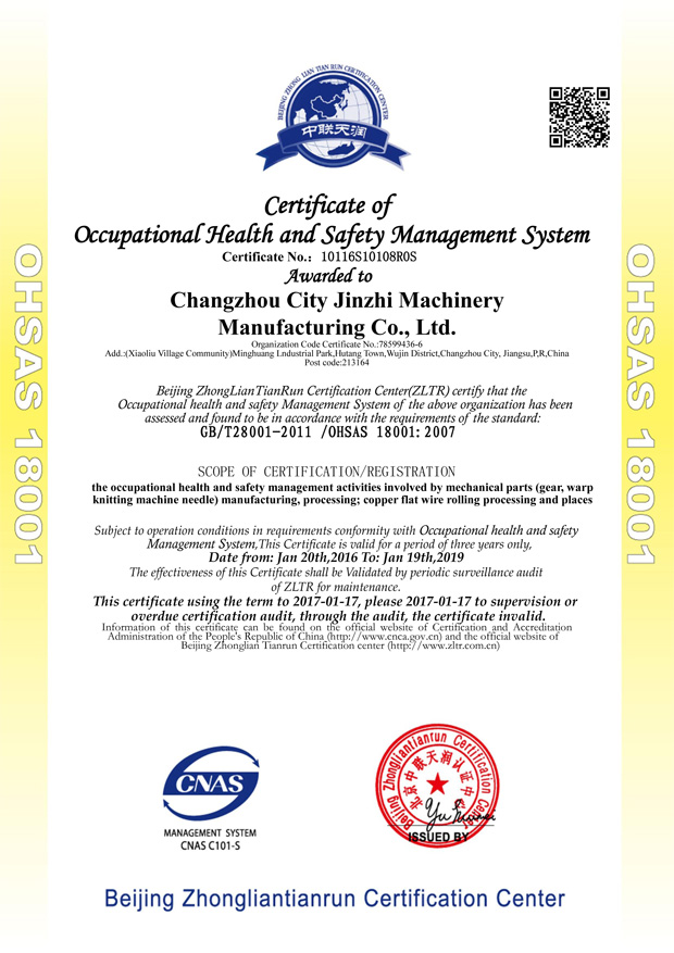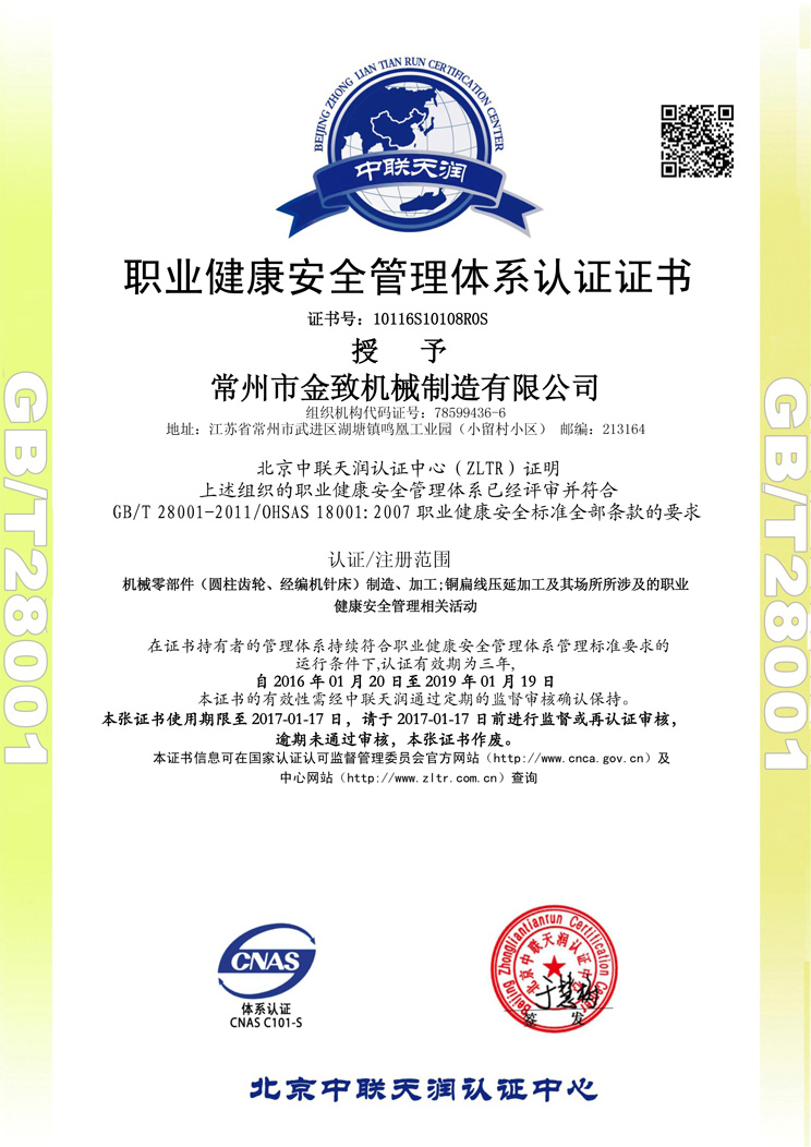 公司通過 GBT18001:2007職業(yè)健康安全管理體系認(rèn)證證書
